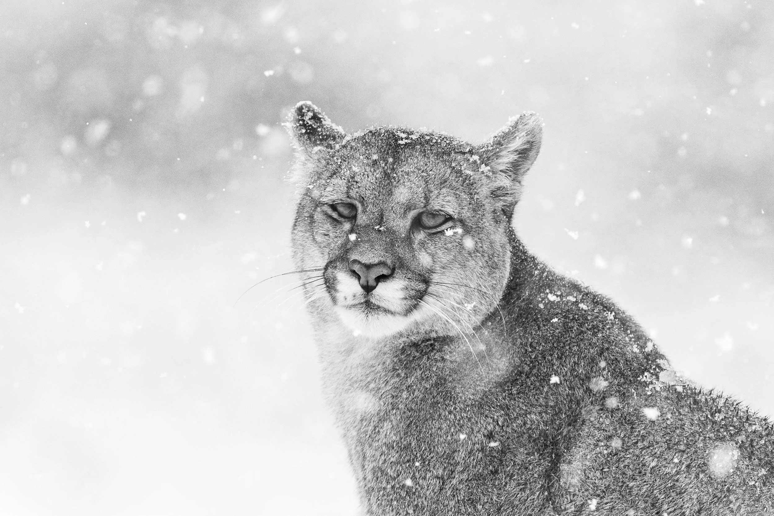 The unseasonal snow storm transformed the Torres del Paine National Park, returning it to winter and making for spectacular conditions for photography. Lying on the cold ground with snow falling, the female puma walked straight towards me. She was not alone, somewhere behind out of sight, a male puma was following her intently, hoping to mate with her. However, this intruder was not the dominant large male known as “Dark”, he would find her later. The approach of the female puma had triggered my body’s fight-or-flight response, the automatic reaction our brain’s trigger when we face perceived danger. This primitive survival mechanism floods our bodies with adrenaline and cortisol, causing our heart and breathing rates to increase and our muscles to tense, preparing us to either confront or flee from danger. Whilst this reaction is designed to protect us, its effects are not conducive to good photography. The local guide I was working with had briefed me to stay still and not to move, the puma would not attack as she did not see me as a threat nor as food. By controlling my breathing I brought the flight-or-flight response under control, relaxing my body, enabling me to photograph the female puma as she continued to walk towards me before she stopped and sat down in the snow. This was the my first encounter with a wild puma, whilst I had many more during my time in Torres-del-Paine, this was the most memorable.